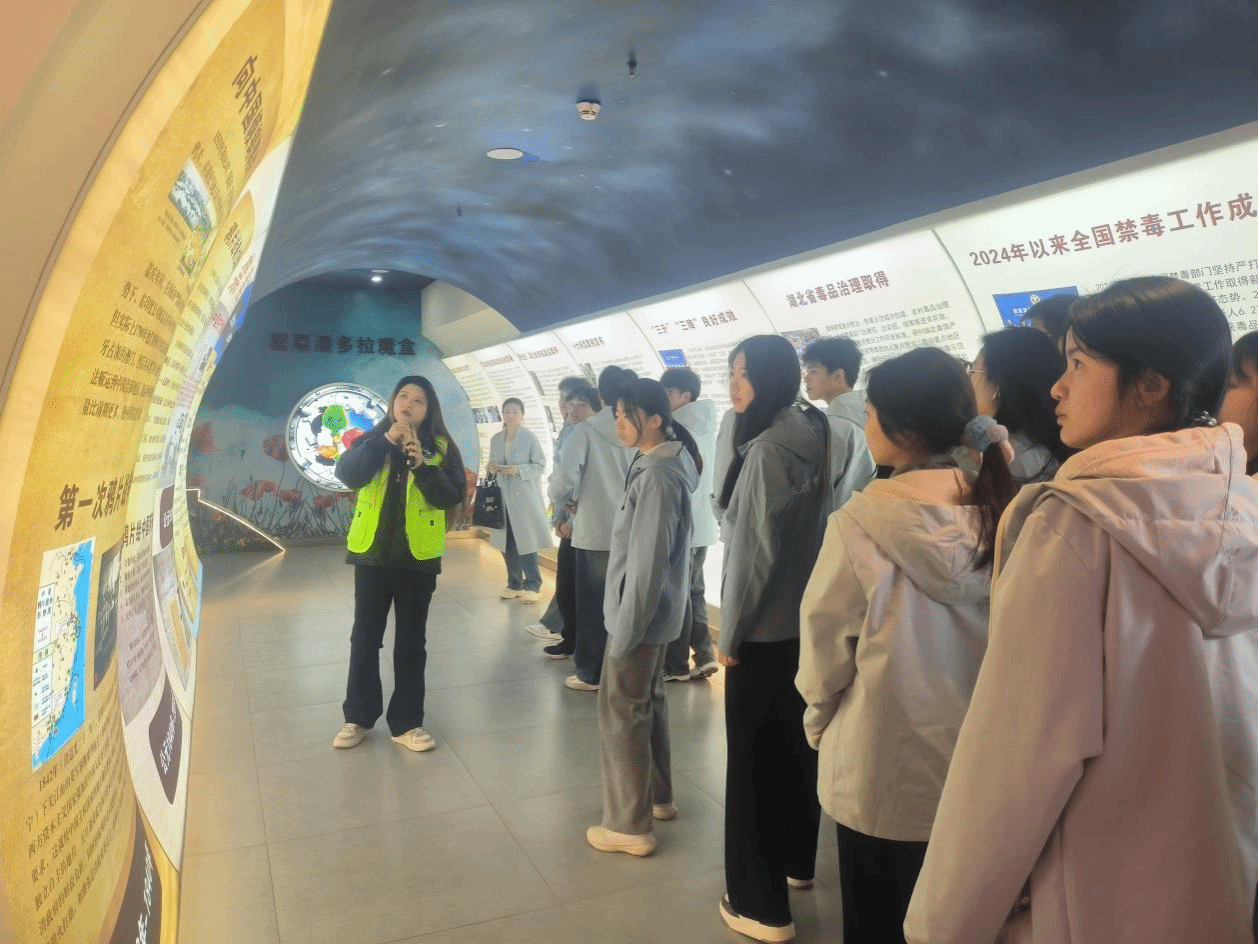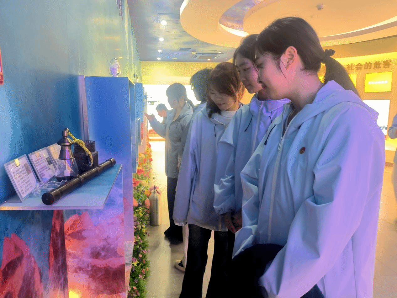 活动现场,团员青年们在基地讲解员的引导下,有序参观禁毒教育各主题展区。通过珍贵的图文史料与发展年表,大家全面了解了我国禁毒工作的百年历程与重大成果,深刻感受国家禁绝毒品的坚定决心与不懈努力。讲解员结合仿真毒品模型,逐一讲解鸦片、海洛因等传统毒品,冰毒、麻果等合成毒品,以及各类极具迷惑性的新型精神活性物质的外观特征与辨别要点,层层揭开各类毒品的伪装陷阱,让大家精准掌握识毒防毒基础技能。
