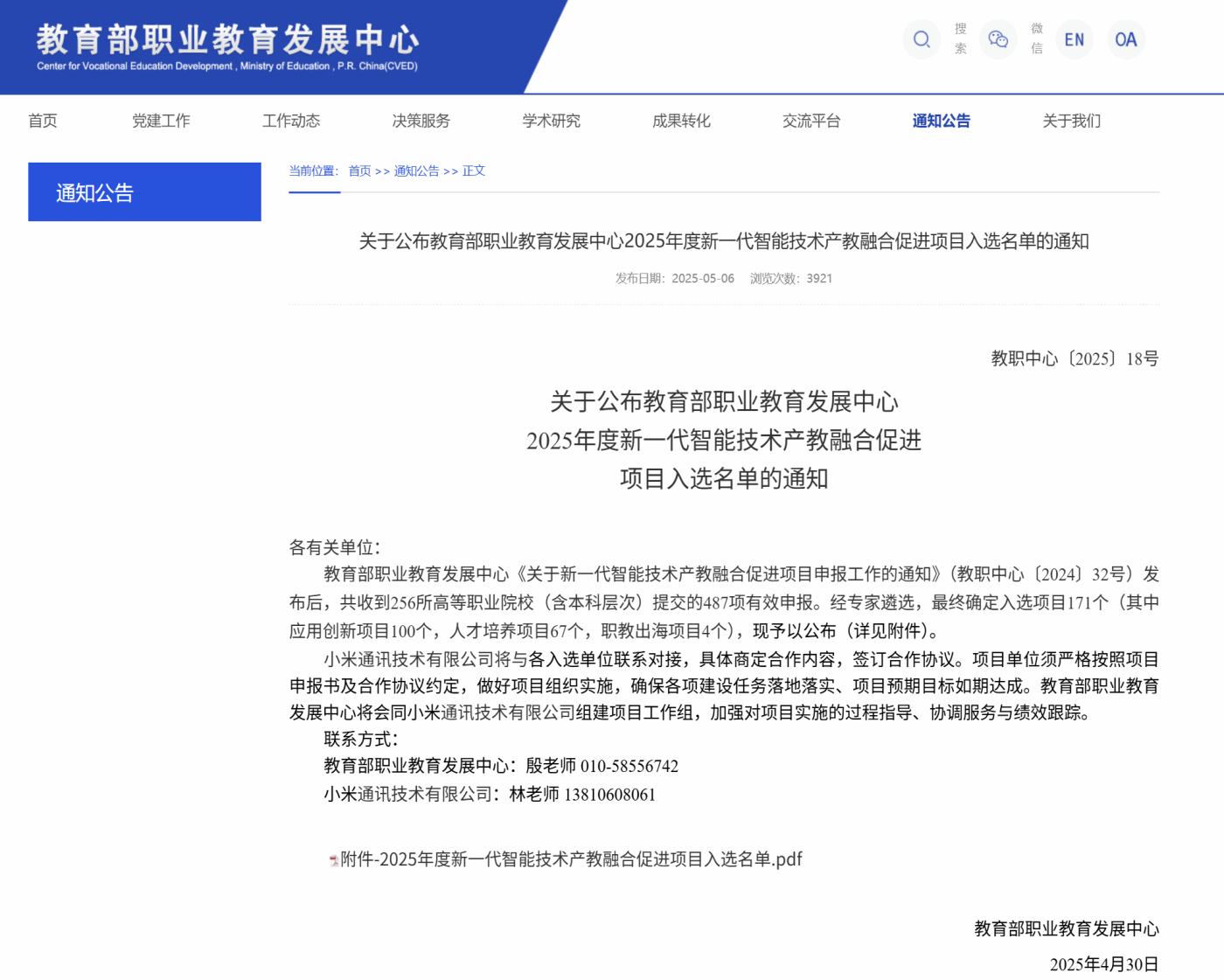 本次项目由教育部职业教育发展中心与小米通讯技术有限公司联合组织实施,聚焦人工智能、智能物联(AIoT)、智能制造、智能网联、新能源汽车、智能产品等六大核心技术领域,旨在推动高等职业院校与头部企业开展深度合作,探索“政产学研用”协同育人的新路径。项目内容涵盖教师能力提升、课程资源开发、实训环境建设、人才适配优化、校企联合科研及国际化办学实践等多个维度,全面支撑新时代高素质技术技能人才培养体系的构建与升级。