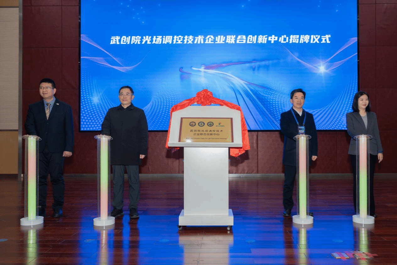 作为创新中心的三家发起共建单位之一,我校长期以来十分重视该领域的产学研融合发展。活动现场,校党委书记蒋兴鹏与参会嘉宾共同为“武创院光场调控技术企业联合创新中心”揭牌,此举标志着中心正式落地运行,也标志着学校在“政产学研金服用”一体化协同创新模式的探索上又迈出了坚实一步。