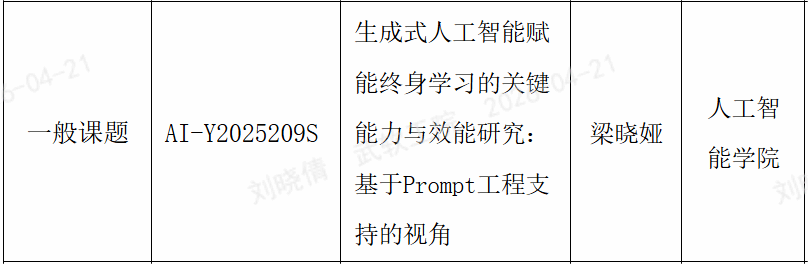 (通讯员 梁晓娅)4月13日,从学校科技处传来喜讯,梁晓娅老师主持的《生成式人工智能赋能终身学习的关键能力与效能研究:基于Prompt工程支持的视角》课题,成功获批中国成人教育协会2025-2026年度“人工智能+终身学习”一般课题。